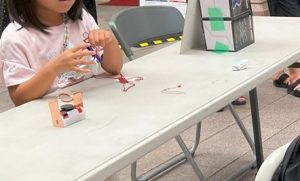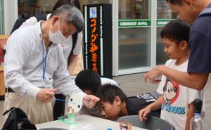 長崎市浜の町アーケードにて、小中学生を対象に電気の面白さを伝える体験型イベントを行った。①手回し発電機を用いて、どれくらいの電力を人力で作れるのかを体験したり、模擬的な水力、風力、太陽光などの発電キットで実際の発電方法を体験してもらった。②電気を直接見る体験としてテスラコイルやプラズマボールをしてもらった。プラズマボールと磁石を用いて放電(プラズマ)を磁界で制御し、フレミングの法則を体験するとともに擬似的な人工オーロラを鑑賞した。③電気を使うものの学習として、クリップモータを作製・体感してもらった。これが、環境に優しいとされる電気自動車を動かす動力になることを説明した。